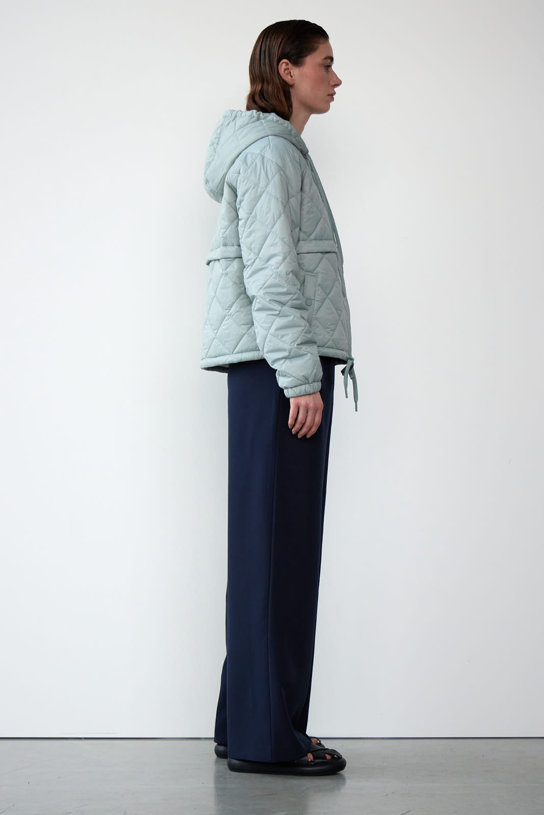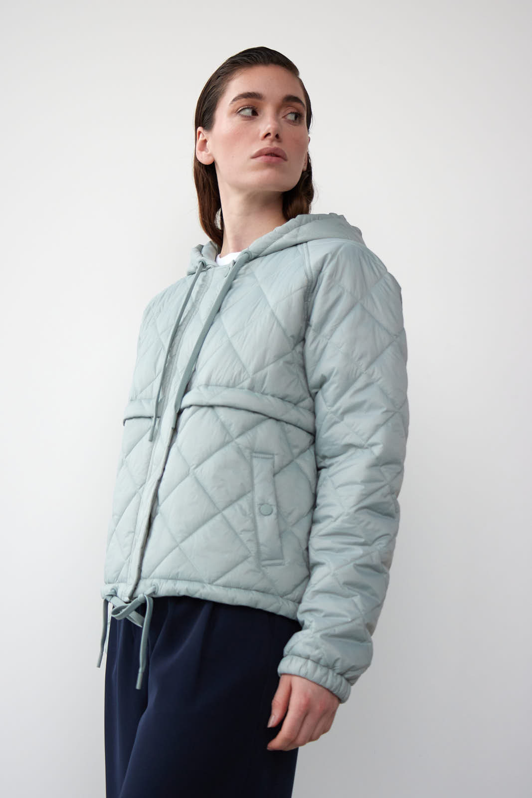 Vi er vilde med denne lette quiltede bomber jakke med hætte og cool snører detaljer.