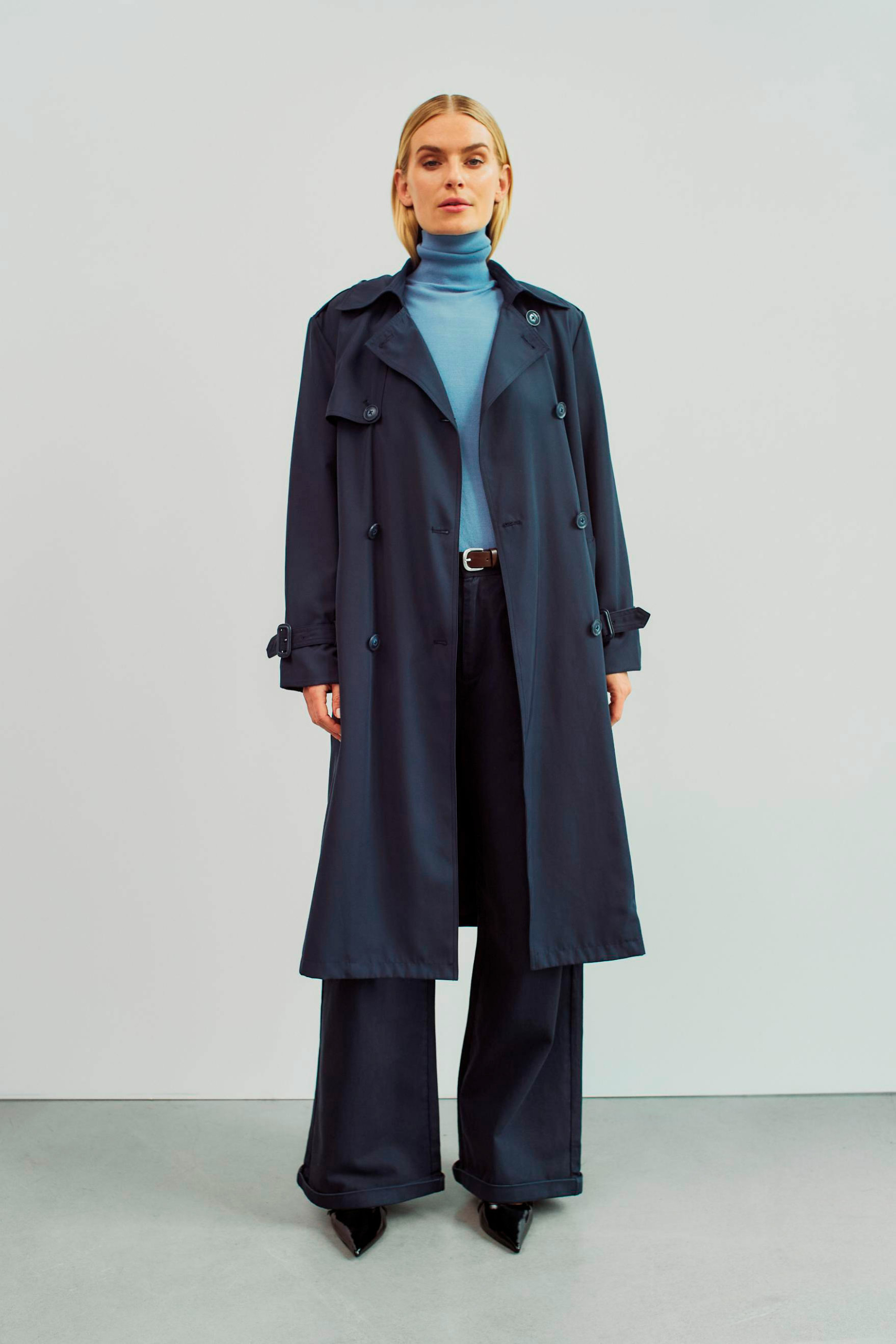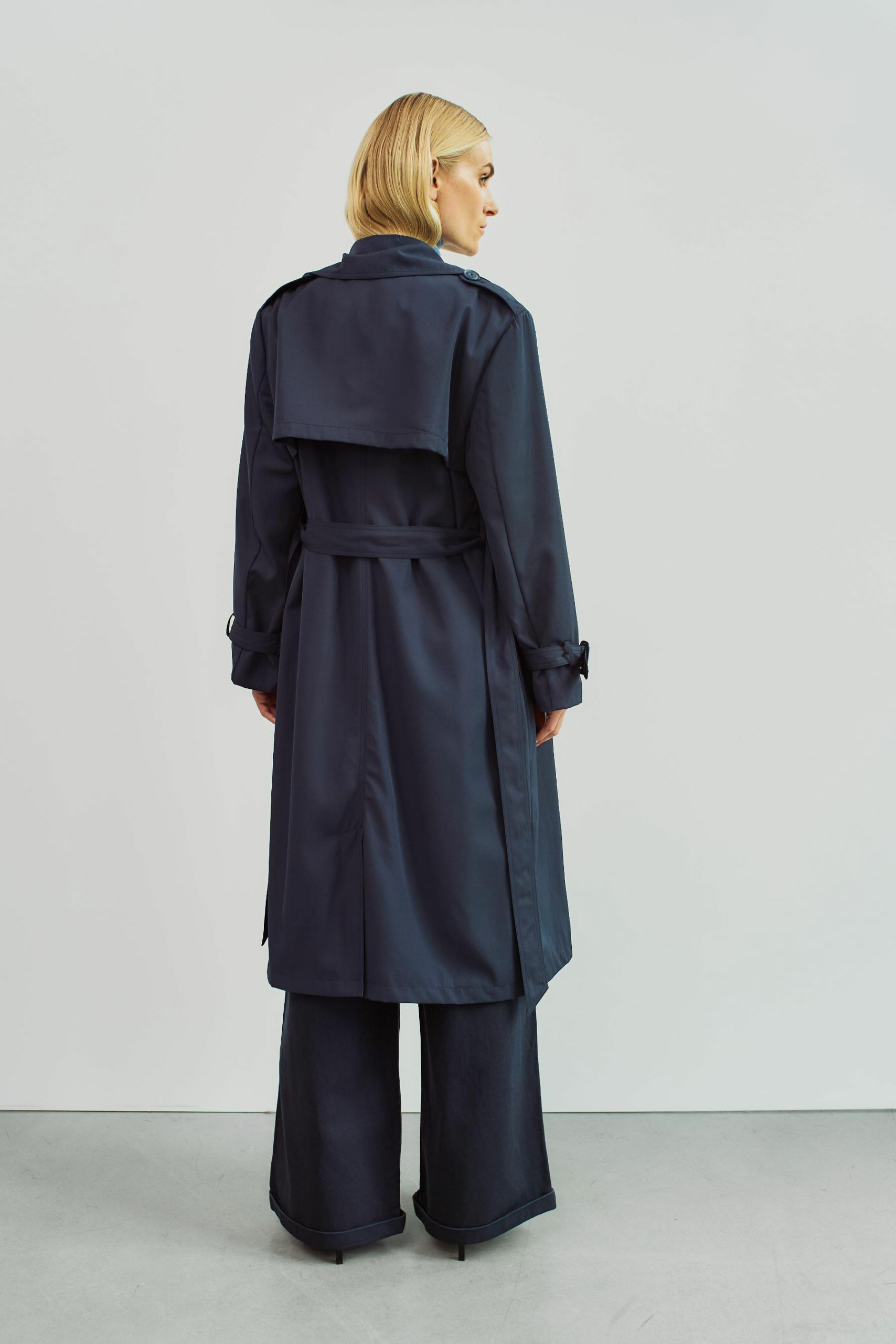 Lækker trench coat med flotte og gennemarbejdede detaljer, bl.a. dobbeltradet knaplukning, bindebælte i taljen, knapdetalje på skulderen, justerbar rem på ærmet, lommer foran og slids bagpå.