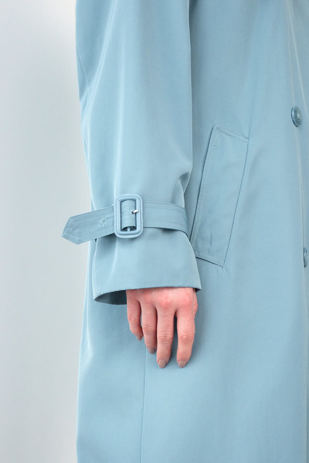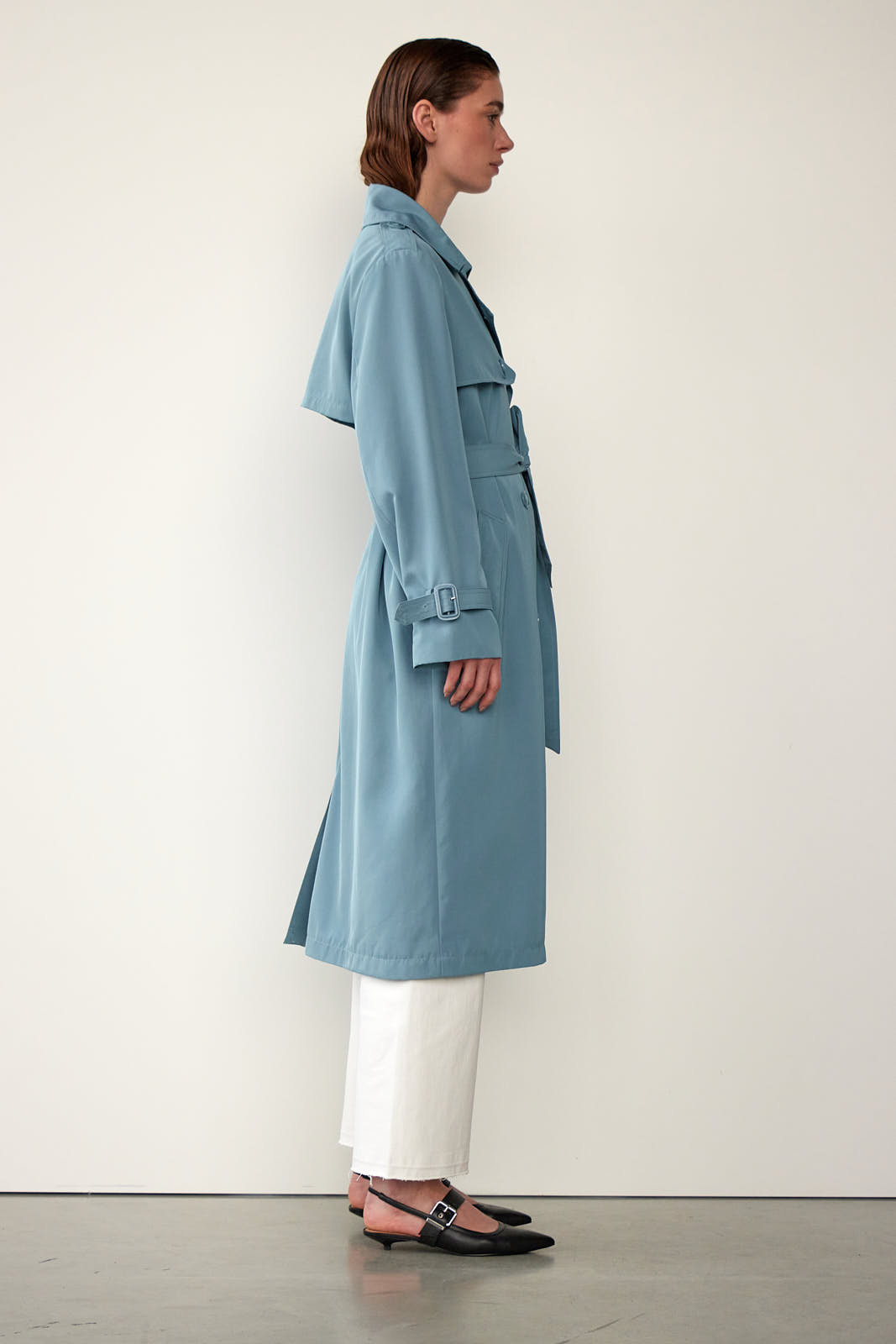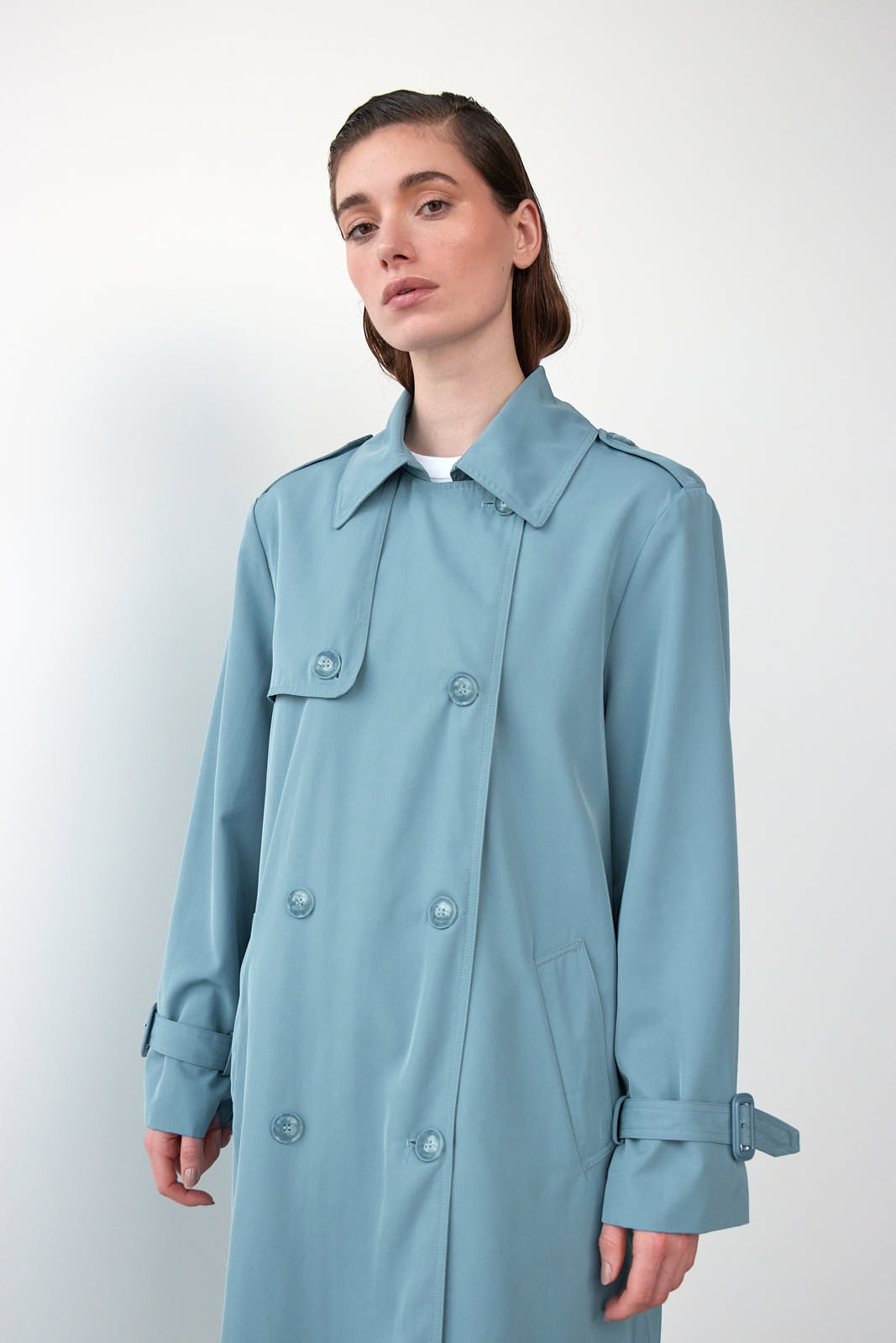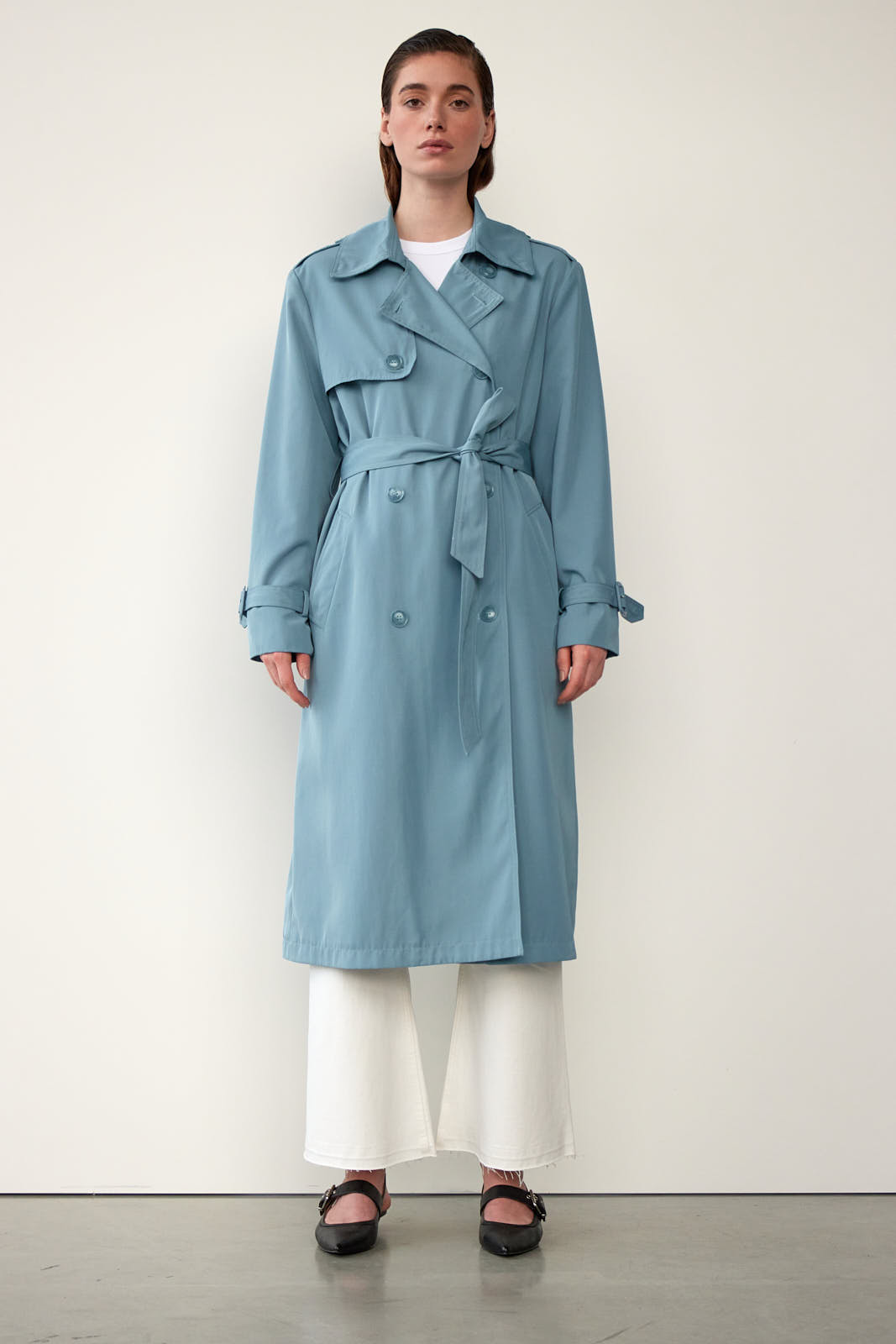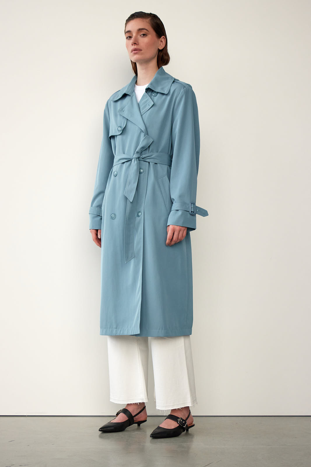 Lækker trench coat med flotte og gennemarbejdede detaljer, bl.a. dobbeltradet knaplukning, bindebælte i taljen, knapdetalje på skulderen, justerbar rem på ærmet, lommer foran og slids bagpå.