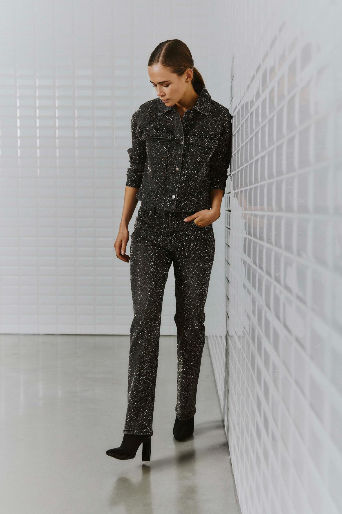 Mørkegrå forvaskede denimbukser med dekoration af Rhin-sten
