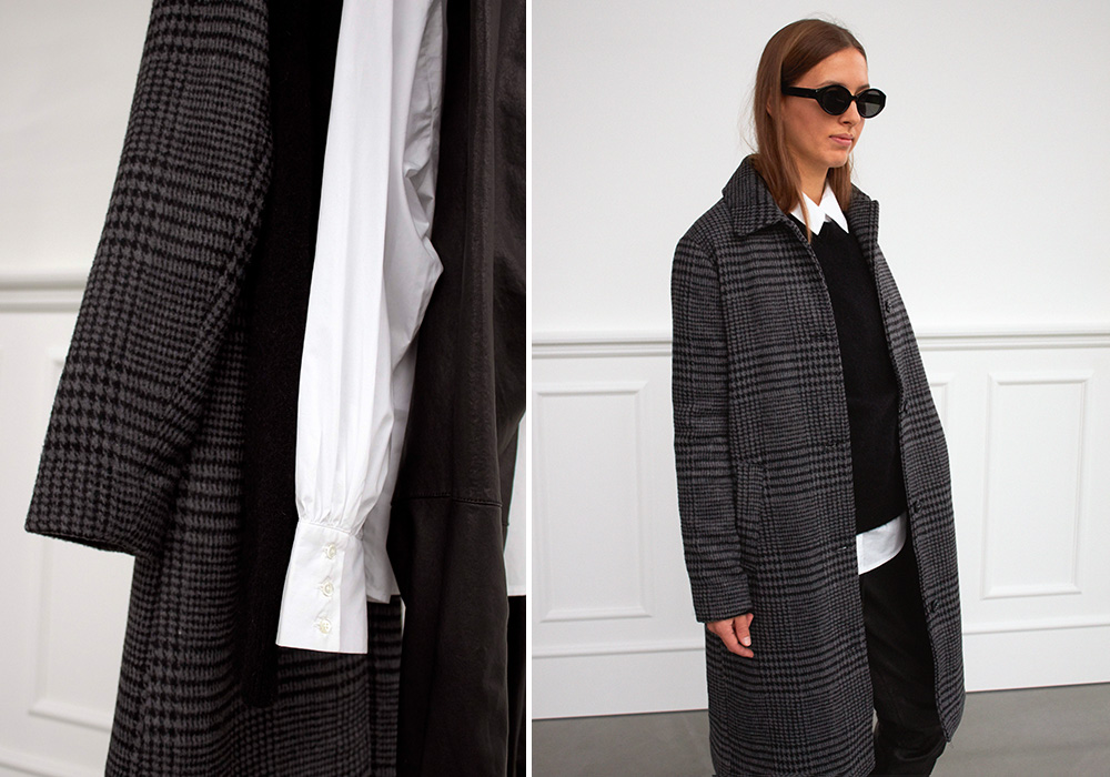 You can’t say Autumn without saying layers. The chilly weather and light layers are an undeniable Autumn duo. Transitional outfits need to have some flexibility – the mornings are often super cold, but as the sun starts to show, temperatures often arise quite a bit. The layered outfit has this covered, and our Sano wool coat is the perfect transitional coat to level up your layer game. It is made from an exclusive wool blend and features side pockets, a wide collar and a classic button closure. We love it as a layered piece over any outfit, but especially paired with a crisp white cotton shirt, a black cashmere pullover and some luxurious leather joggers. Its black and grey muted colours palette is easy to style with neutral coloured layers for a sophisticated Scandinavian look.